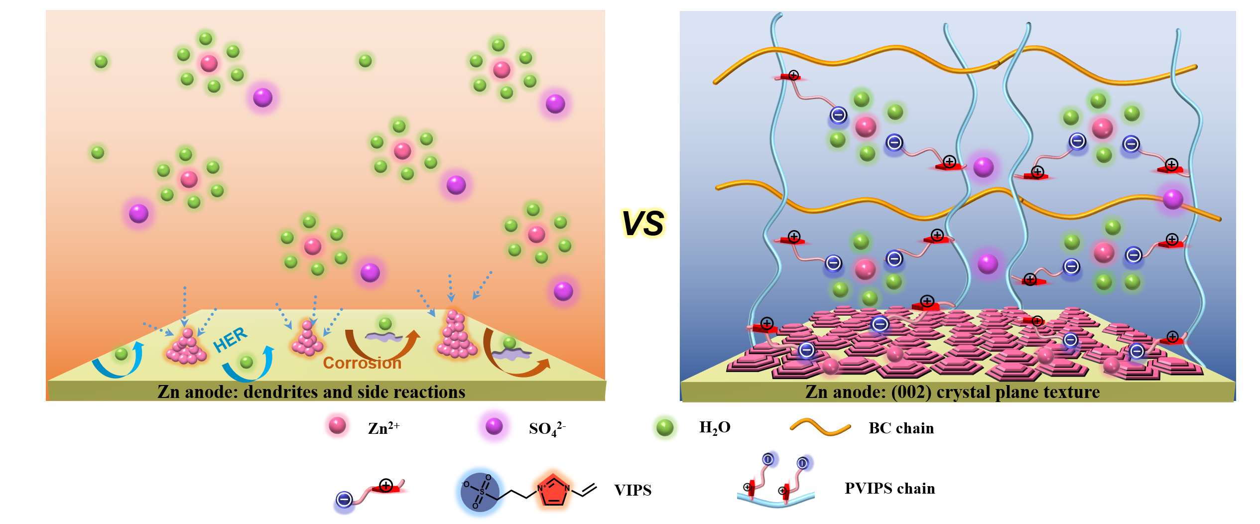 Zinc (Zn) metal anode has been widely evaluated in aqueous Zn batteries. Nevertheless, the dendrite formation issue and consecutive side reactions severely impede the practical applications of Zn metal at high current densities. Herein, it is reported that engineering the gel electrolyte with multifunctional charged groups by incorporating a zwitterionic gel poly(3-(1-vinyl-3-imidazolio) propanesulfonate) (PVIPS) can effectively address the abovementioned issues. The charged groups of sulfonate and imidazole in the gel electrolyte can texture the Zn2+ nucleation and deposition plane to (002), which possesses a high activation energy to resist side reactions and induce uniform growth of Zn metal for a dendrite-free structure. In addition, the Zn2+ solvation structure can be manipulated by the charged groups to further eliminate side reactions for high rate performance Zn batteries. Consequently, the polyzwitterionic gel electrolyte enables a stable cycling with a cumulative capacity of 3000 mA h cm−2 at high density of 7.5 mA cm−2 for the symmetrical Zn battery, and a long-term cycling life for more than 1000 cycles at 5 C of Zn/MnO2 full battery. It is envisioned that the design of the gel electrolyte will provide promising feasibility on safe, flexible, and wearable energy storage devices.